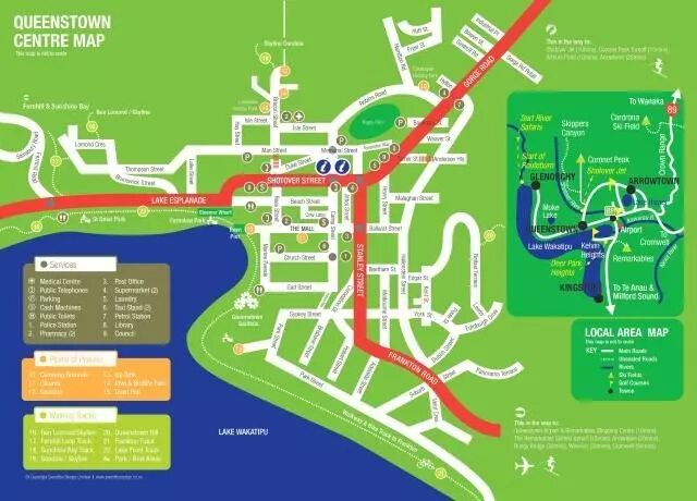 我們看下面這張皇后鎮中心的地圖,小鎮中心由三條紅色標志的主干道貫穿,沿著瓦卡蒂普湖的形狀形成“丁”字形。整個市中心25.55平方公里,差不多步行一天可以走完,但這小小的市中心每年游客的接待量超過300萬。
